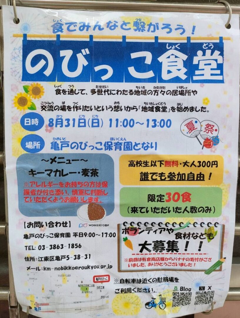 『のびっこ食堂』は、亀戸五丁目中央通り商店街の中にある「亀戸のびっこ保育園」の隣のスペースで行われる地域食堂(こども食堂)です。