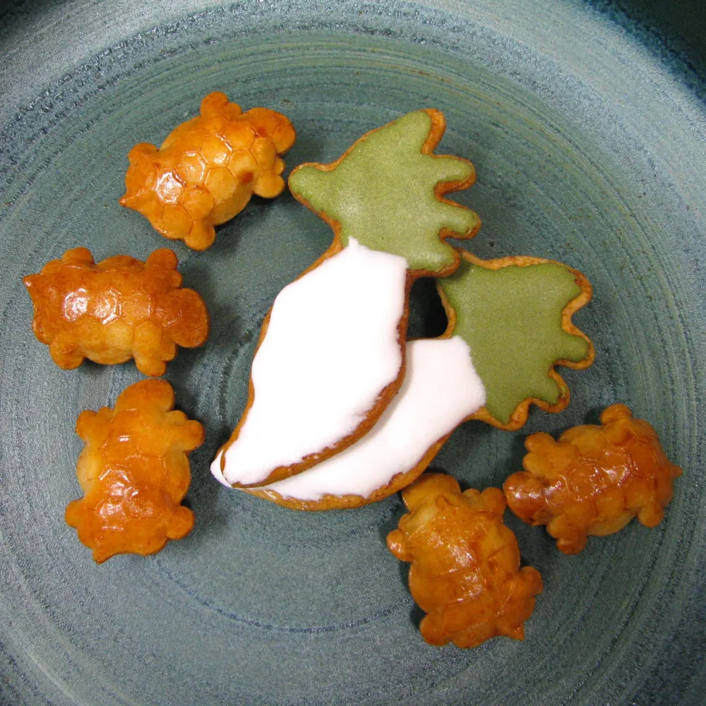 亀戸名物の「亀戸大根」の形をした煎餅「亀戸大根せんべい」と、ぷっくり小さな亀の形がかわいらしい「亀の子せん」をご紹介します。